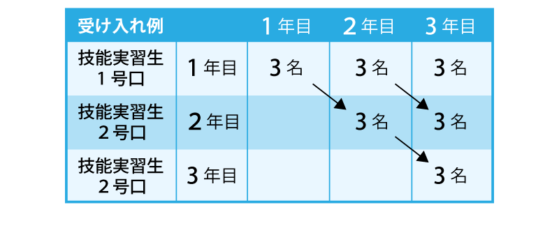受け入れることができる技能実習生の人数枠は、常勤職員(雇用保険加入者で技能実習生を除く)の数(規模)によって違いがあります。